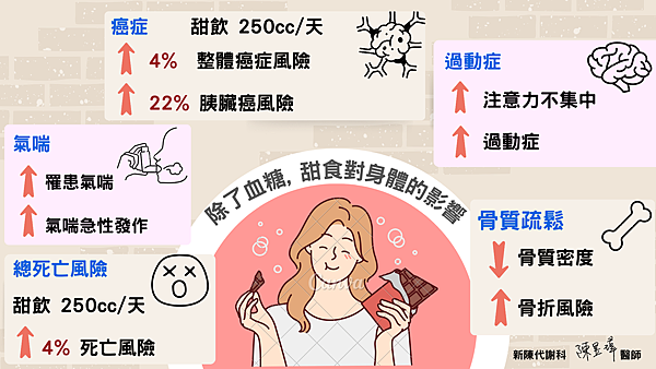 前文提到甜食會增加慢性病、肥胖、血管疾病的風險,甜食在為我們的味蕾帶來享受的同時,也帶來許多其他健康的風險。包括增加癌症風險、氣喘和過動症/注意力不集中等等問題。