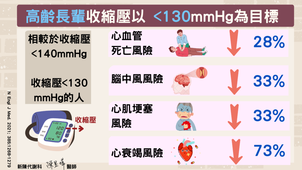 一項針對 ”75歲以上” 長者所做的研究發現:將收縮壓控制在120 mmHg左右,相較於控制在140 mmHg,能顯著降低心腦血管疾病(如心臟病、中風)的發生率達34%,總死亡風險減少了約33% [1]。此外,嚴格控制血壓也不會增加高齡族群昏倒、跌倒的風險 [2]。