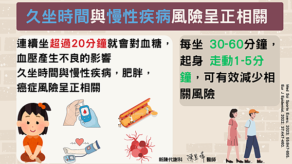 即便有運動習慣,長時間久坐仍被證實與慢性疾病風險密切相關,如高血糖、血脂異常和肥胖等[1]。此外,久坐時間的增加也與大腸直腸癌、攝護腺癌、乳癌、卵巢癌及子宮內膜癌等癌症風險的提升有關 [2]。不少研究發現,中斷連續久坐,有助於改善心臟和代謝的健康 [3, 4]。